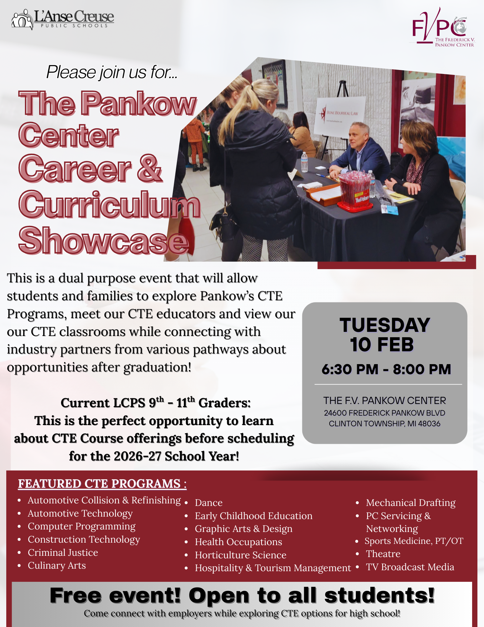 - Career & Curriculum Showcase Night - February 10, 2026 - This is a free, dual event open to all ages! Meet our CTE teachers and learn about career-focused high school courses offered here at the Pankow Center. Additionally, explore career options and paths; meet and greet real career professionals representing several of Michigan's high-wage, high-demand career clusters.